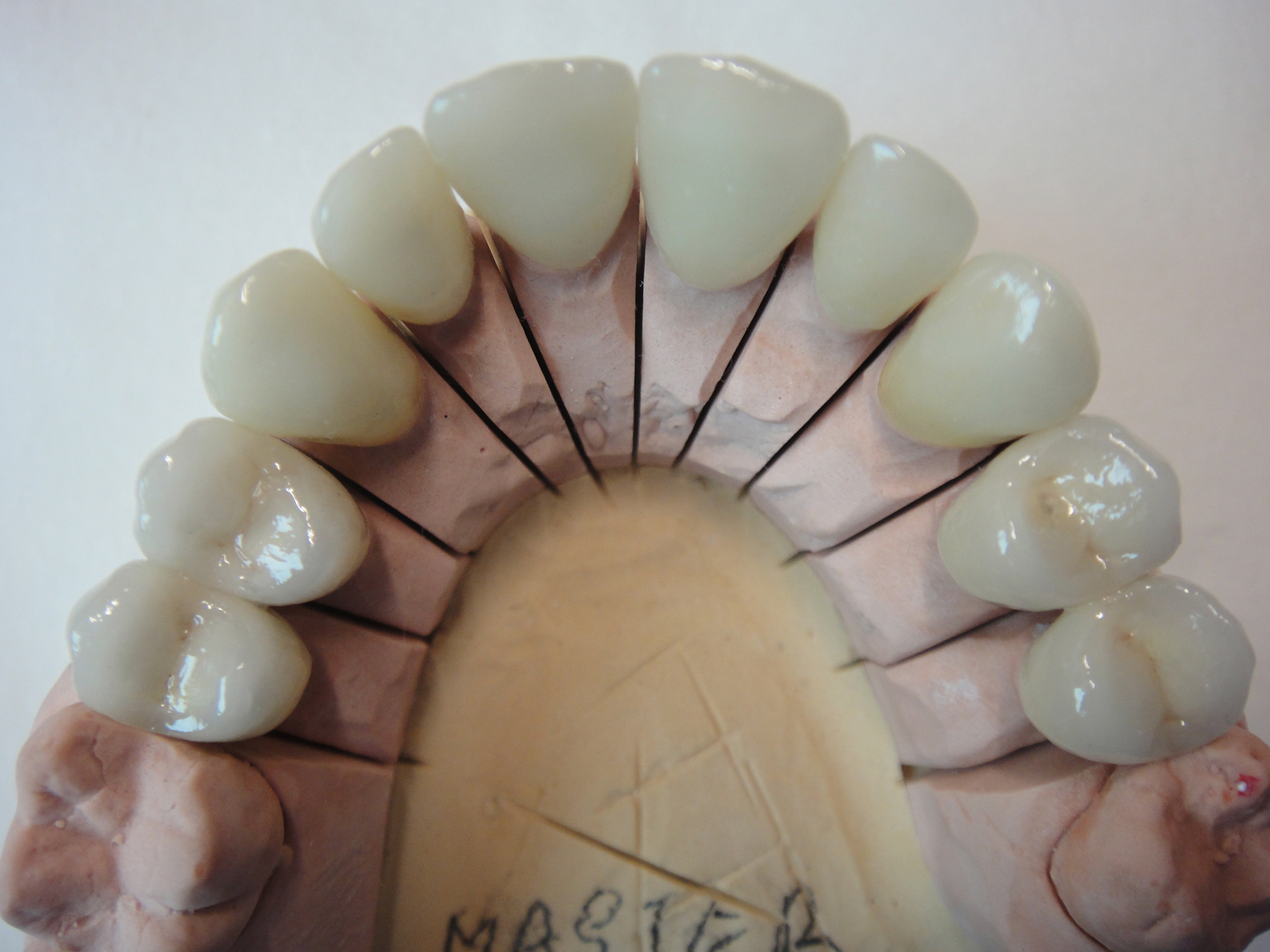 Riabilitazione dell'intera arcata superiore invalidata da restauri incongrui con corone in ceramica prive di metalli.